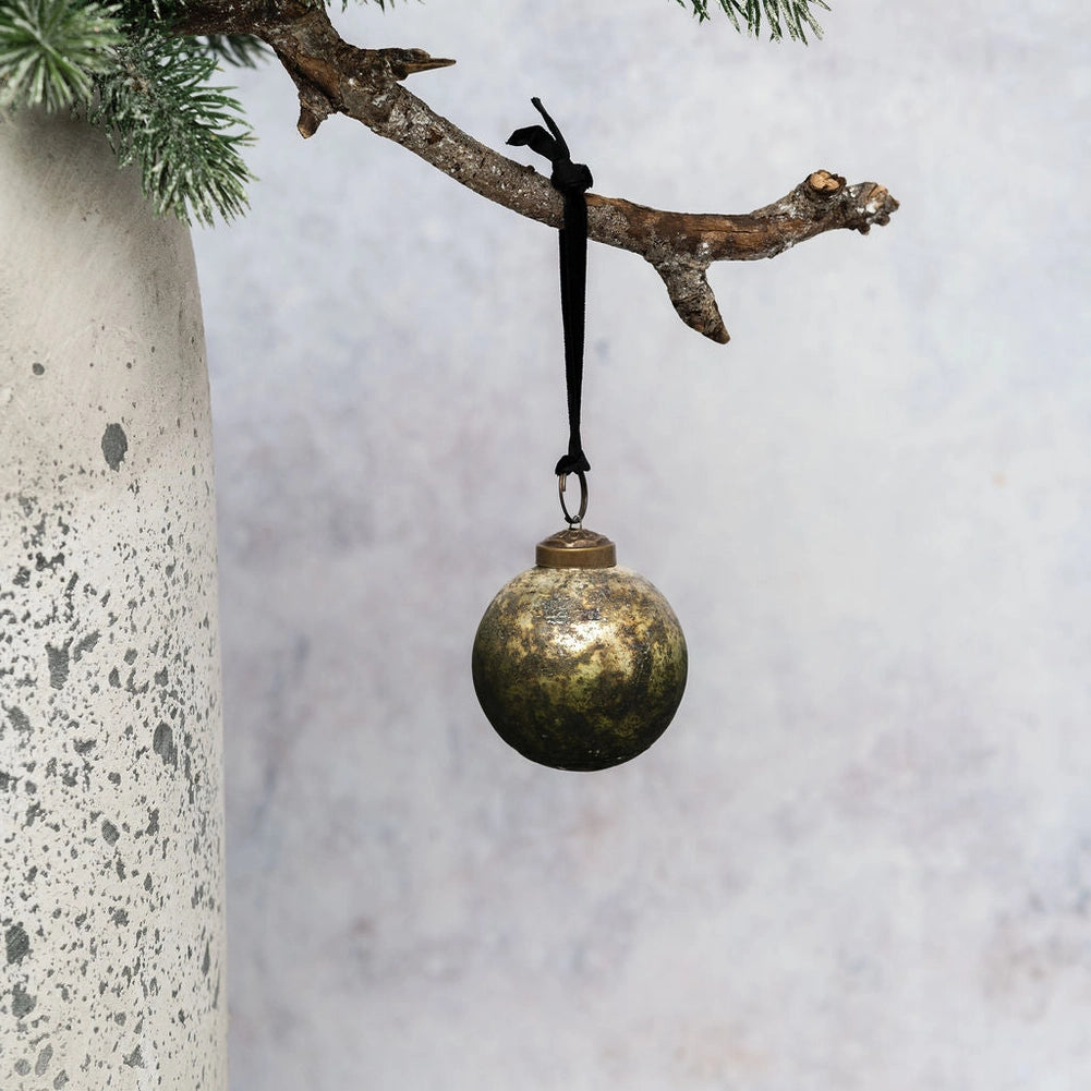 This rustic bauble is mouth blown from Glass, by skilled artisans in India. It features a myriad of colours, with the main base hue being a shade of Green, which shows through the aged patina. Made with a Matt rather than a high shine finish this decoration will add moody depth to your tree. Measuring approximately 5cm in Diameter