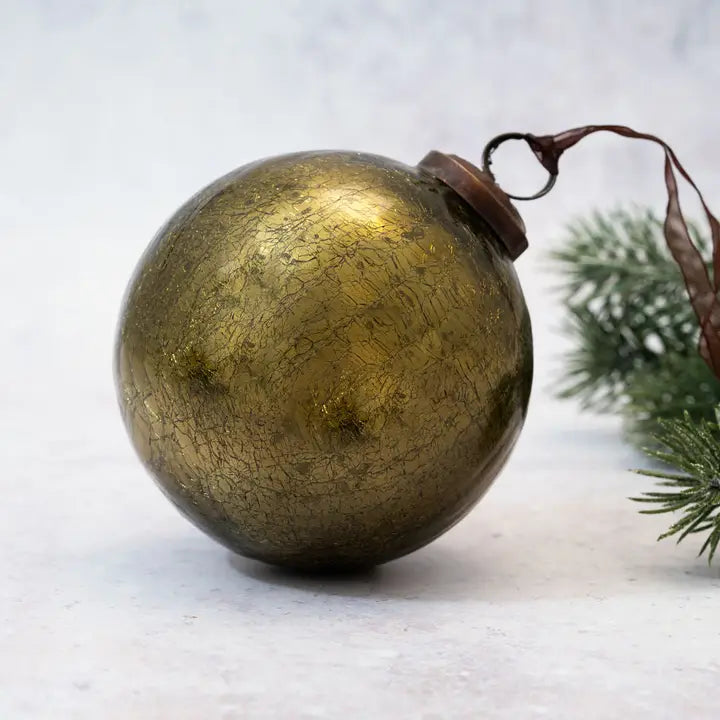 An Extra Large 4" sized hand blown glass bauble measuring approximately 10cm with an ornately decorated bronze cap, and co-ordinating organza ribbon. These baubles are very big, and heavy (300g). Only suitable for larger trees/branches or for hanging around the house.