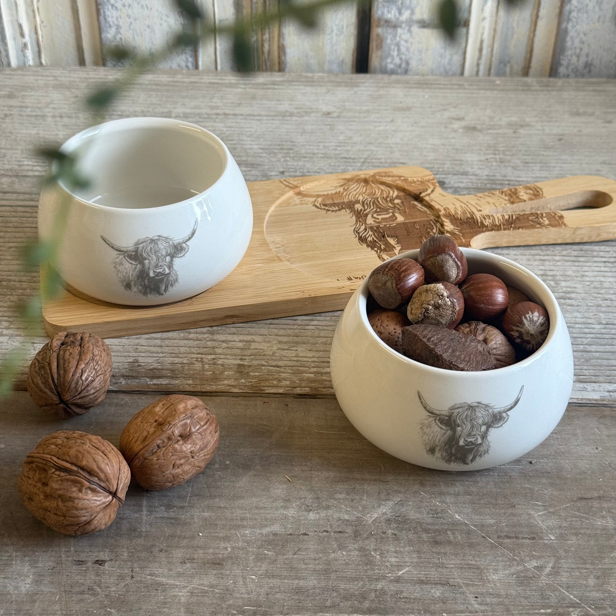 Serve nibbles in rustic style with this charming Set of 2 Bowls on Bamboo Tray - Highland Cow. Two rounded ceramic bowls, each decorated with a delicate Highland cow illustration, sit neatly on a smooth bamboo paddle tray complete with a thumb hole for easy carrying and hanging. Perfect for dips, olives, nuts or condiments, the set brings a cosy country feel to coffee tables, grazing boards and supper spreads alike.