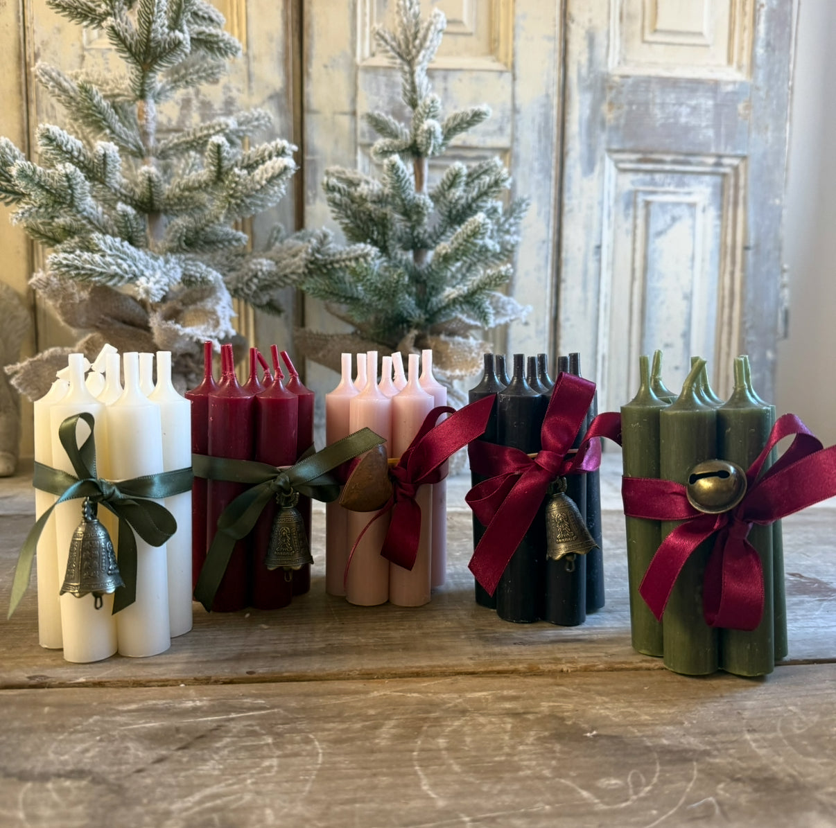 A bundle of 7 short candles , finished with ribbon and a hanging decoration.