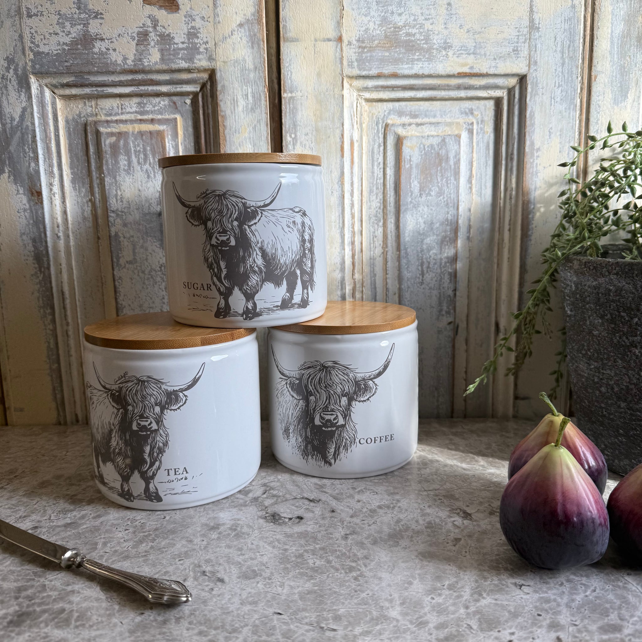 Bring rustic charm to your worktop with this Storage Jar with Wooden Lid - Highland Cow style. Crafted from smooth white ceramic and finished with a detailed sepia sketch of a Highland cow, it pairs countryside character with everyday practicality. The natural bamboo lid features a snug silicone seal to help keep contents fresher for longer, while the generous jar is easy to fill and wipe clean.