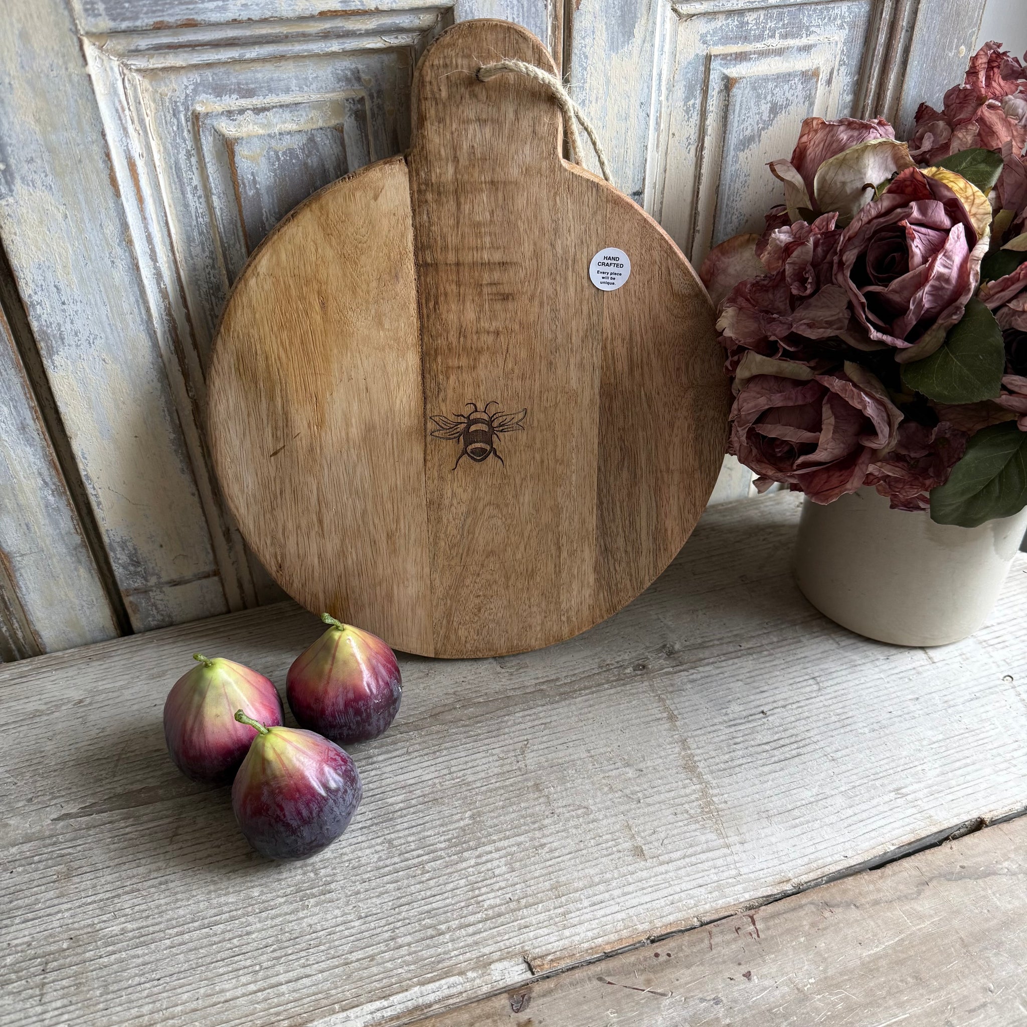 Crafted from sustainably sourced mango wood, this charming round chopping board is essential for any kitchen. Each board features a unique heat-stamped bee design, adding a touch of nature-inspired beauty to its rustic appeal. This board is not only perfect for daily meal preparation but also serves as a delightful serving platter. The natural grain of the wood and the distinctive bee motif combine to make this a lovely gift or a stylish addition to your own kitchen essentials.