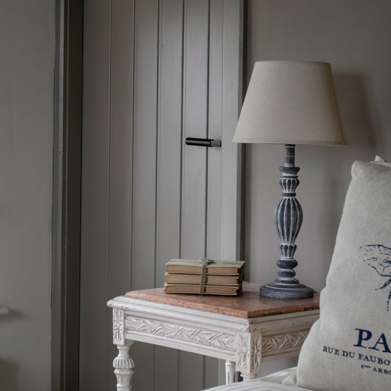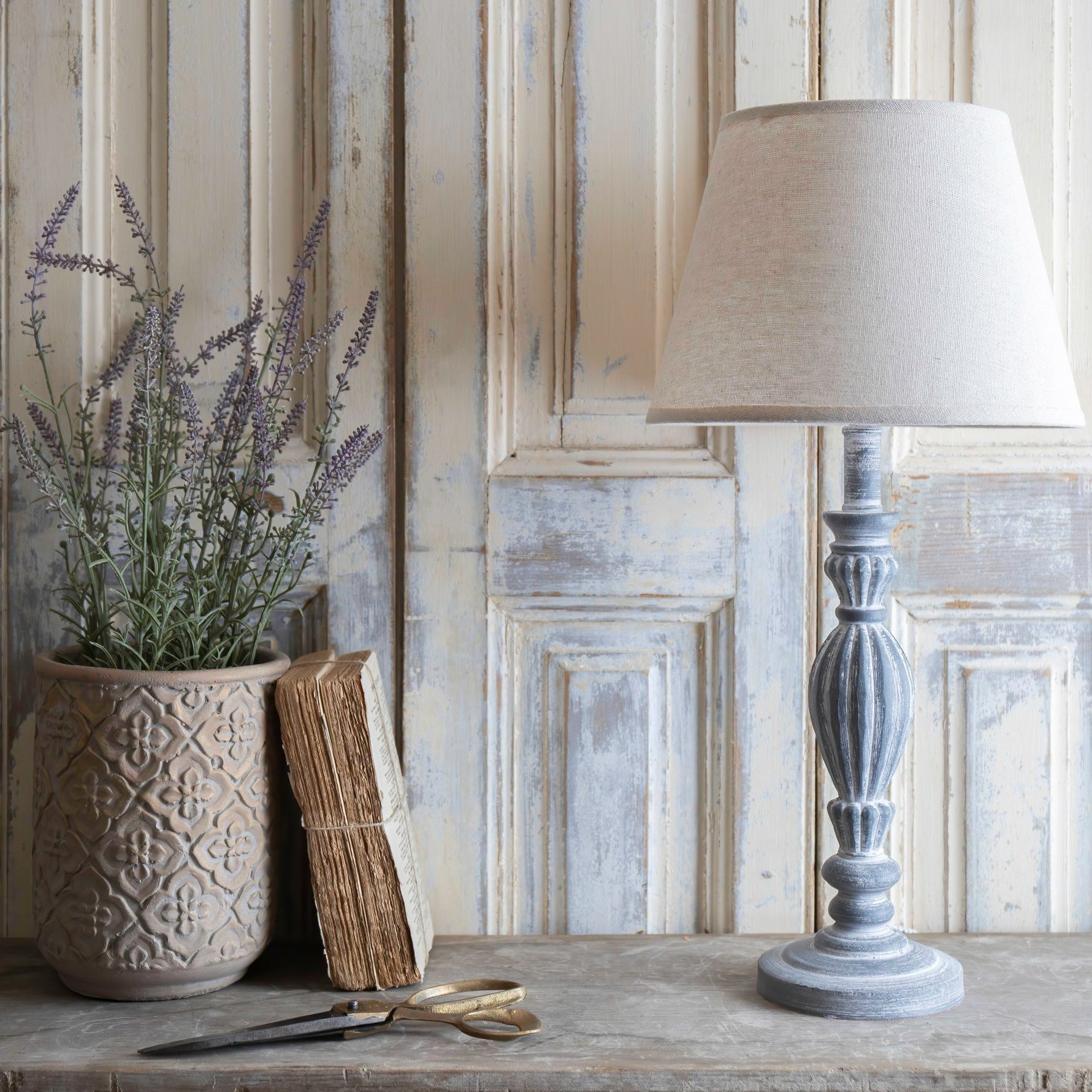 This lovely lamp has a grey wash base and a natural shade.