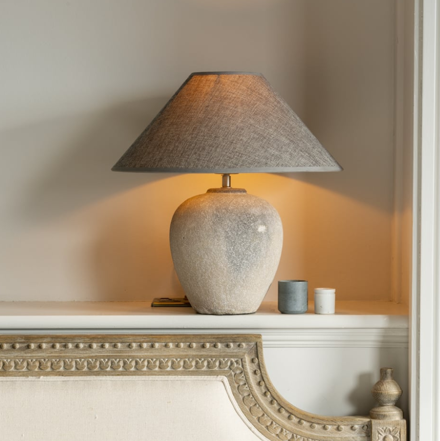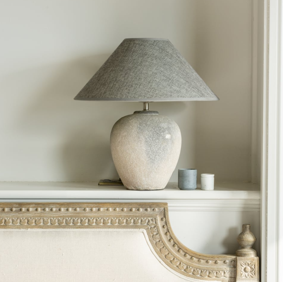 A ceramic lamp with stone effect, paired with a complimenting shade.