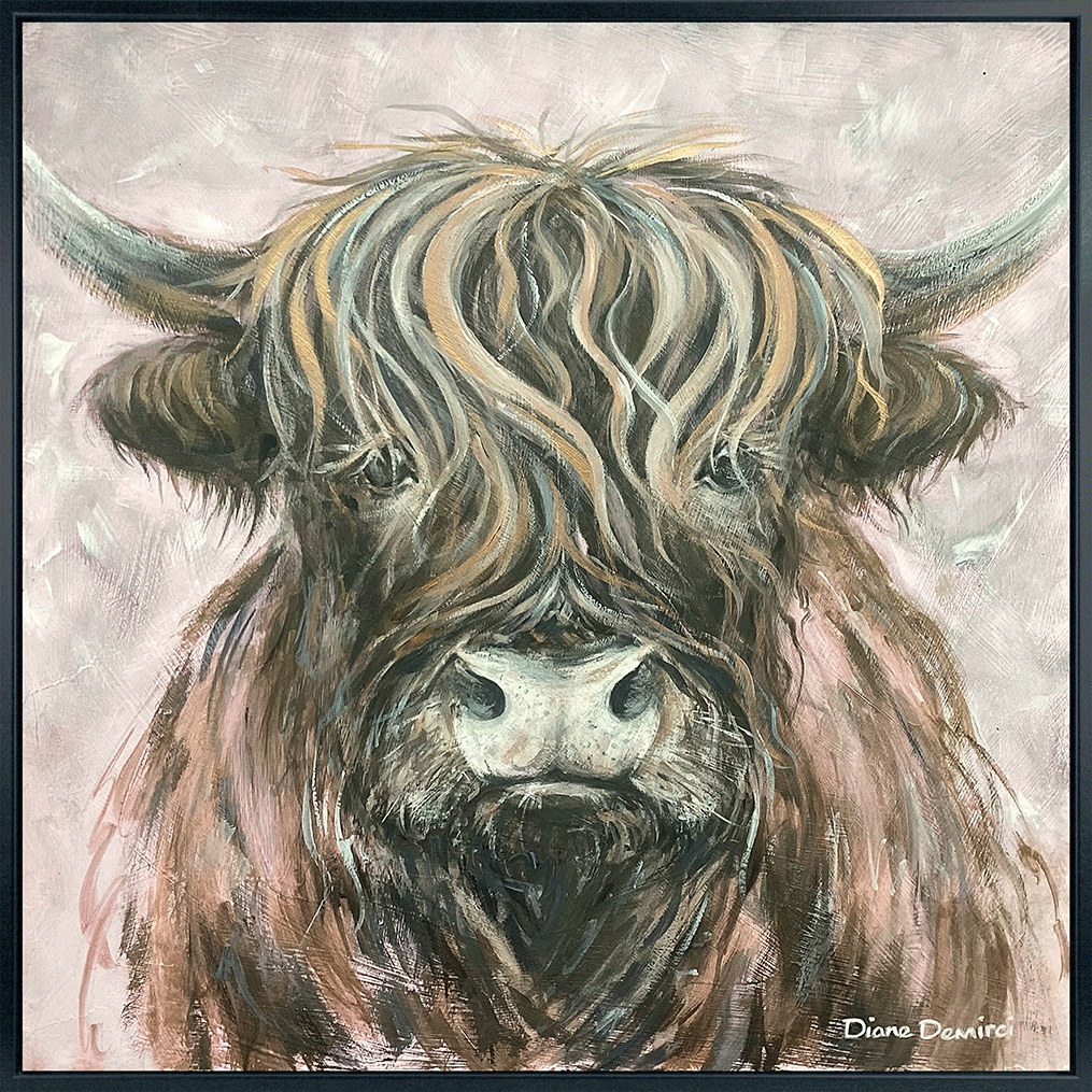 Bruce is brand new animal artwork from artist Diane Demirci, framed canvas finished in a simple matt Black L Shape frame.