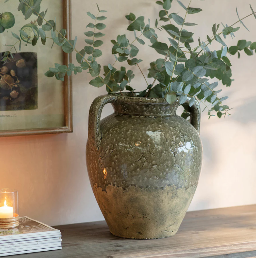 Inspired by classical vessel forms, reimagined with a relaxed, handcrafted finish. Made in stoneware and finished with a softly mottled green glaze, its rounded body and narrow neck create a sculptural silhouette that feels timeless and grounded. Subtle surface variation adds depth and character, celebrating the beauty of artisanal craftsmanship. Ideal for displaying branches, dried stems or as a standalone decorative piece.
