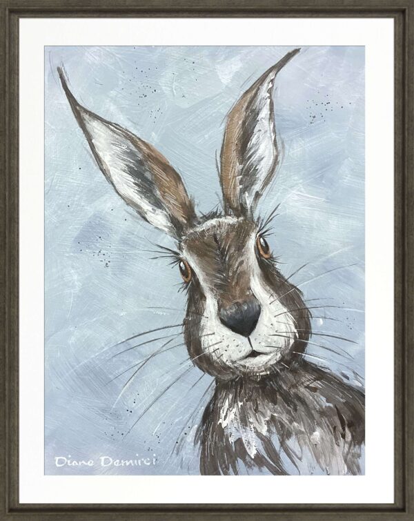 Harvey is a gorgeous, whimsical Hare finished with a dark wood frame and a white mount.