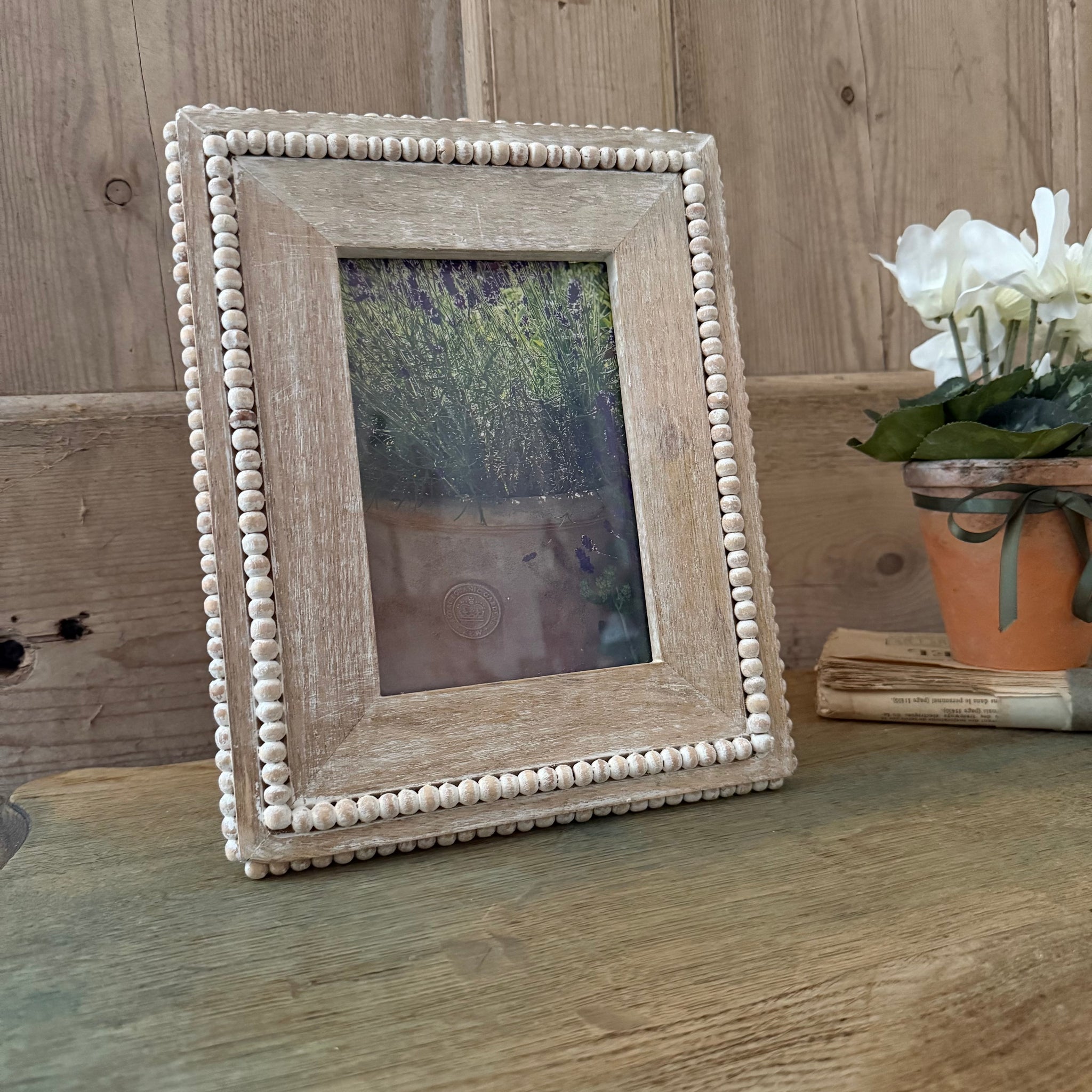 Large photo frame made from mango wood in a natural finish, featuring a beaded border design and fitting a 5 x 7 inch photograph.