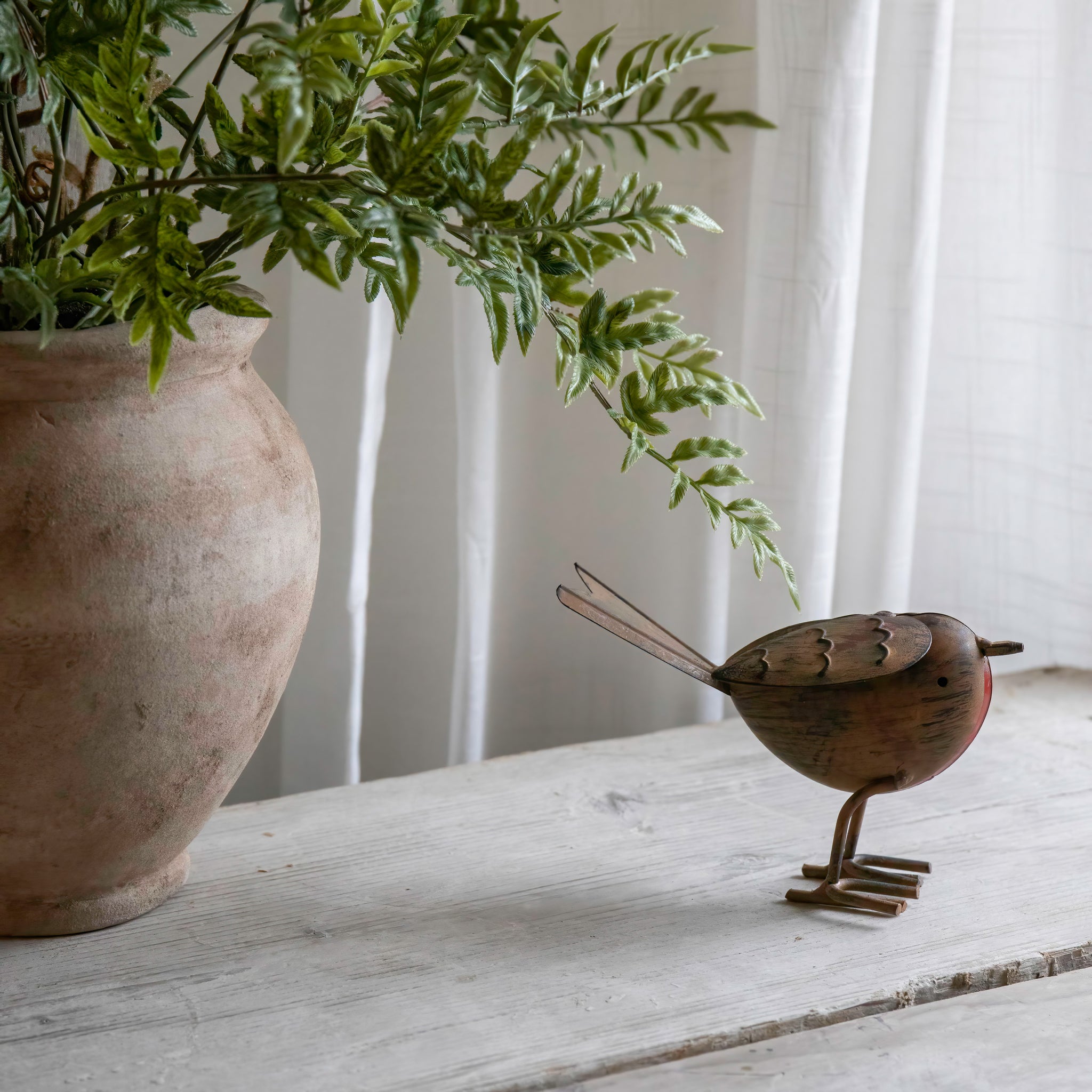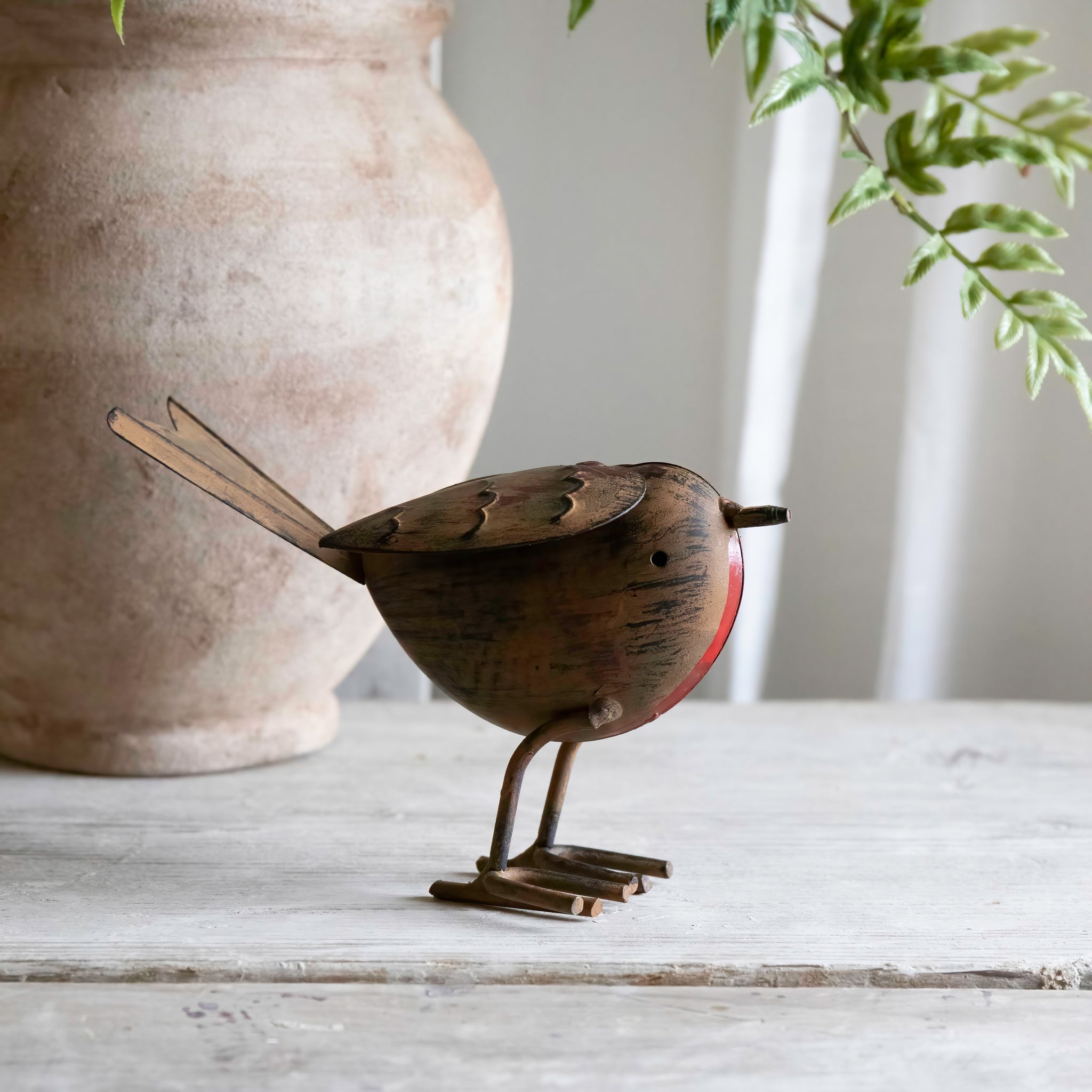 A tin robin , lovely as an indoor or outdoor decoration.