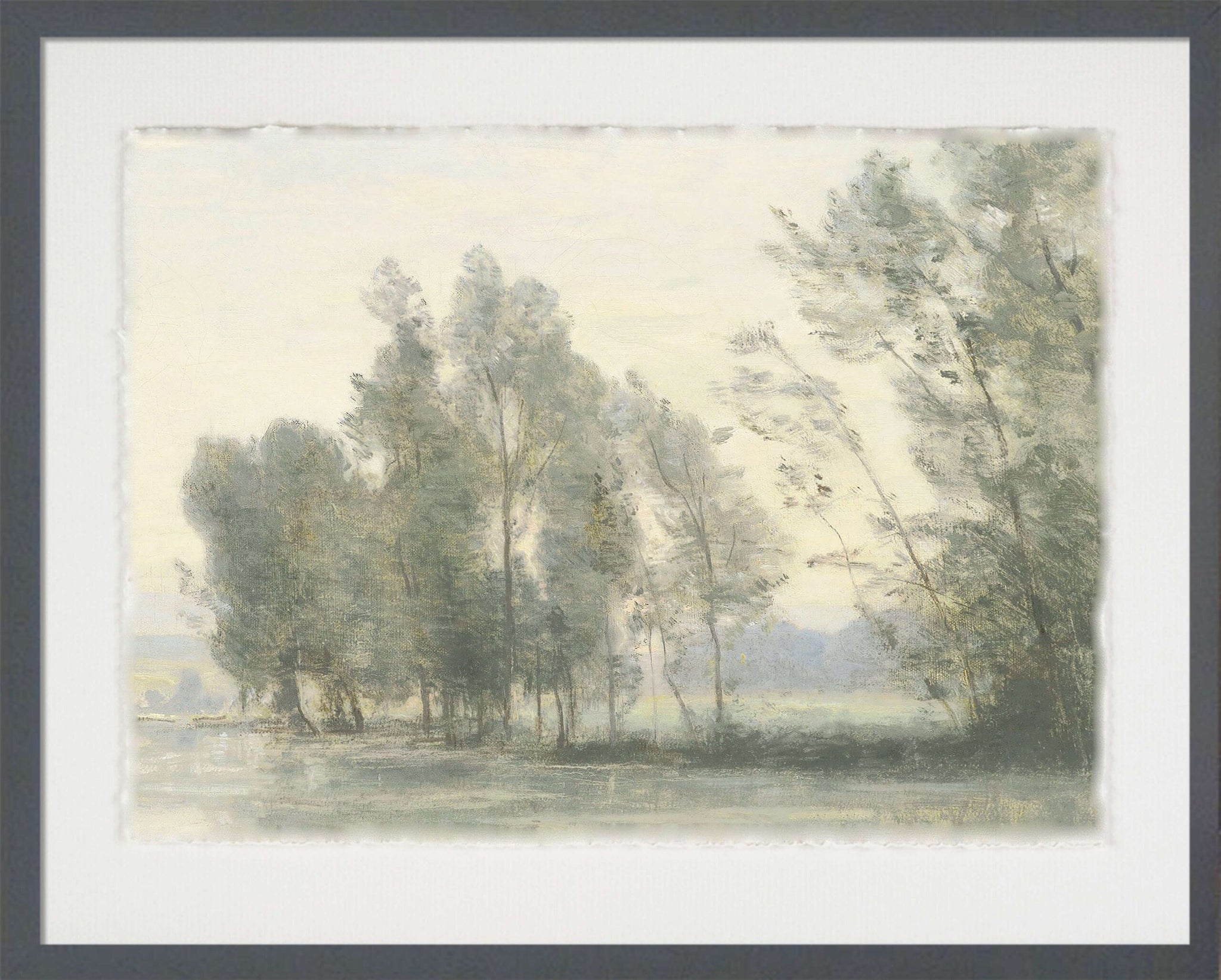 The torn edge watercolour paper goes perfectly with this pastel print, and is framed in a dark grey box frame in order to create a distanced effect.