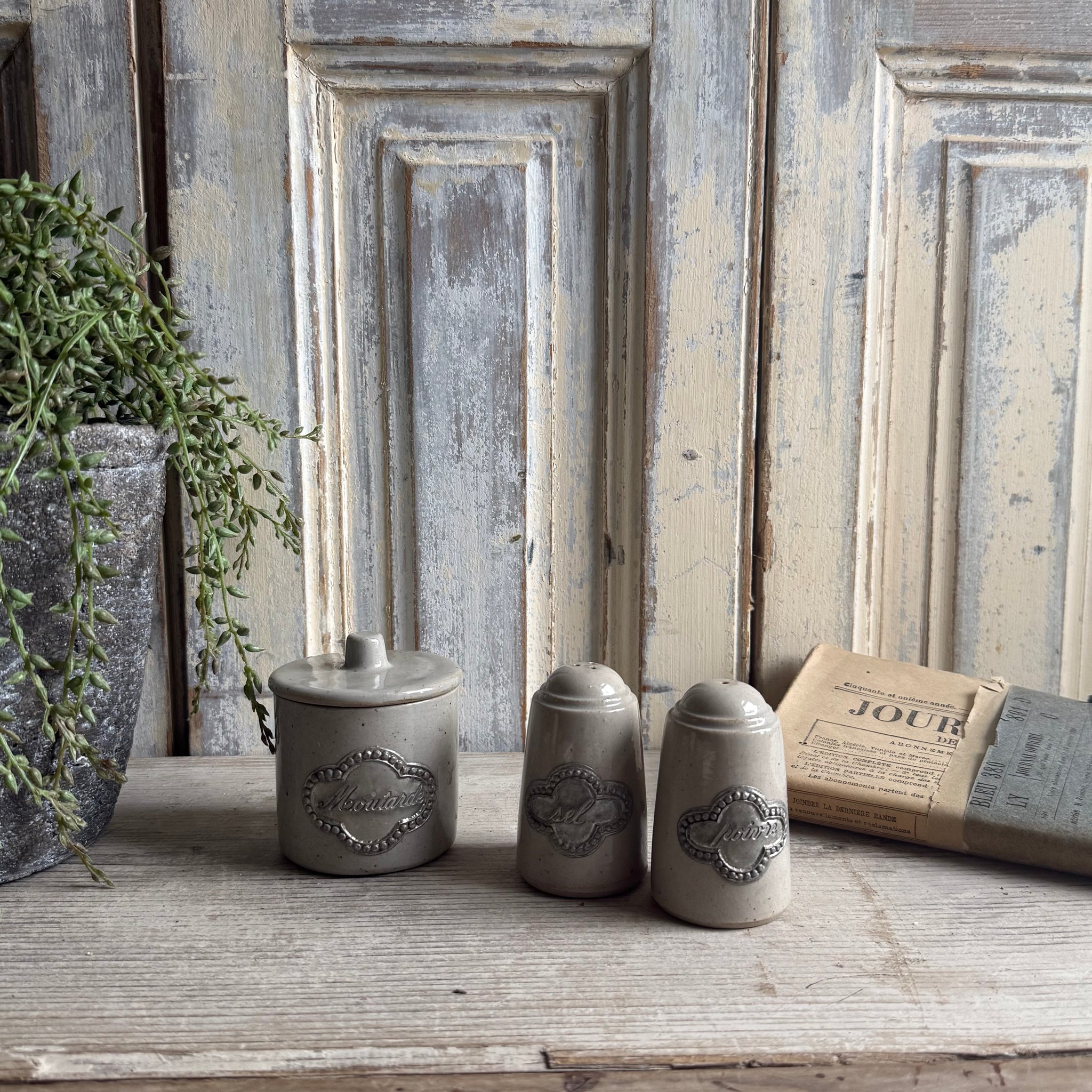 Salt & Pepper pots and a lidded Moutarde pot.