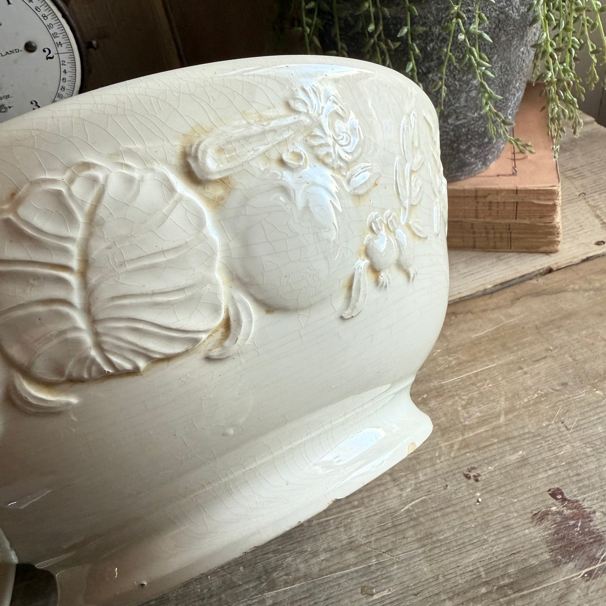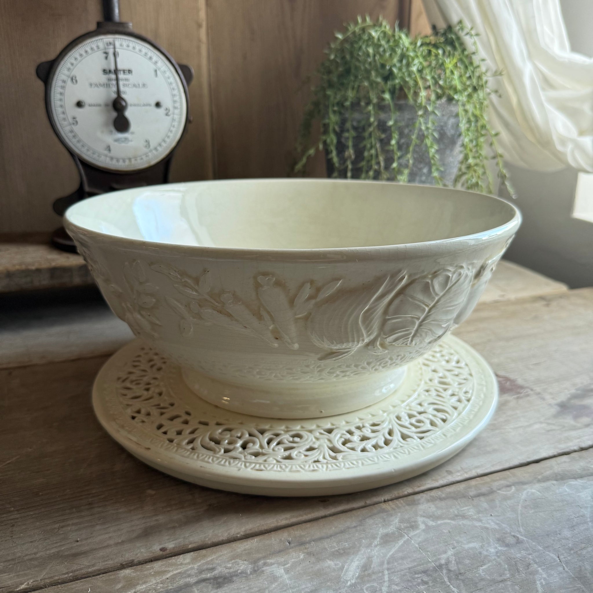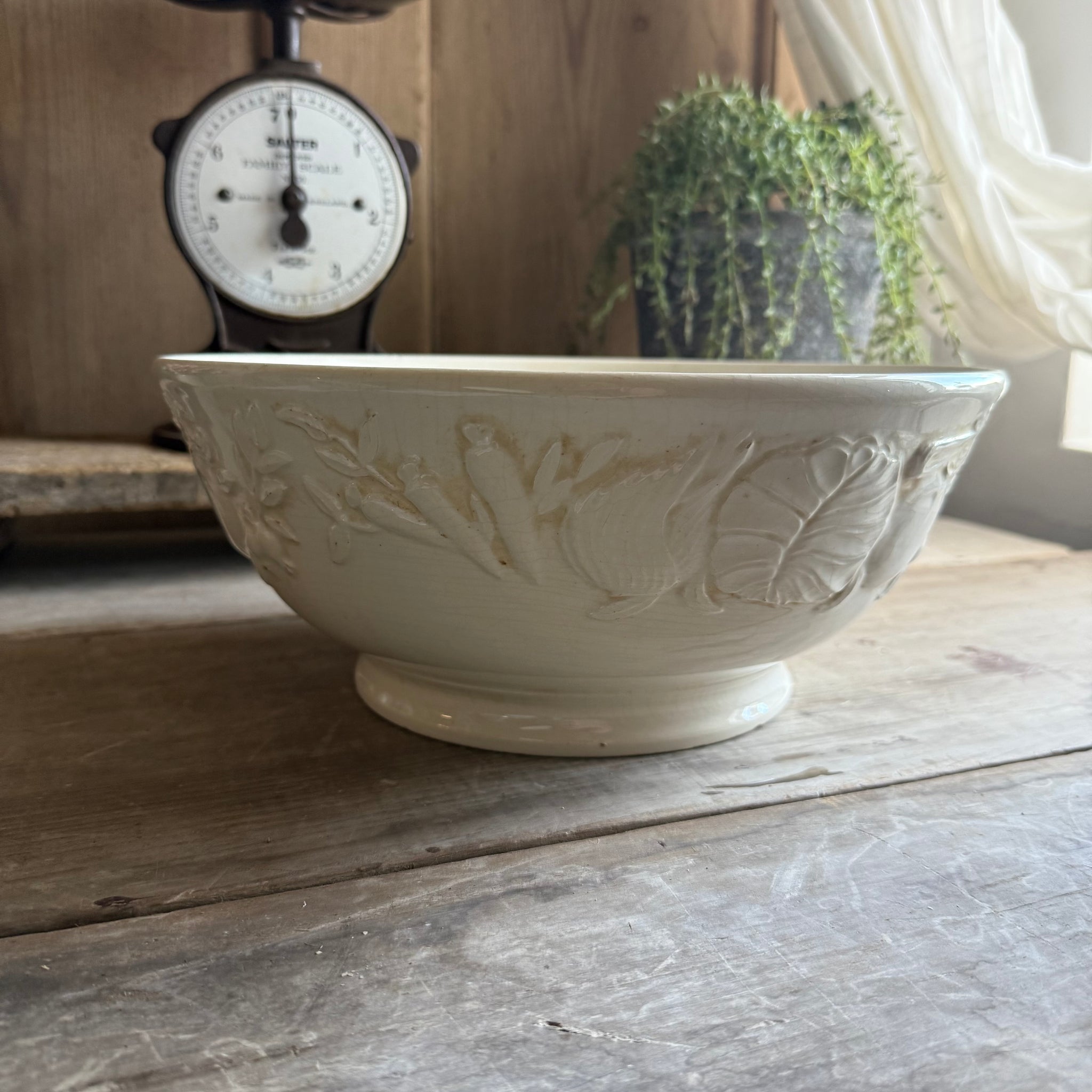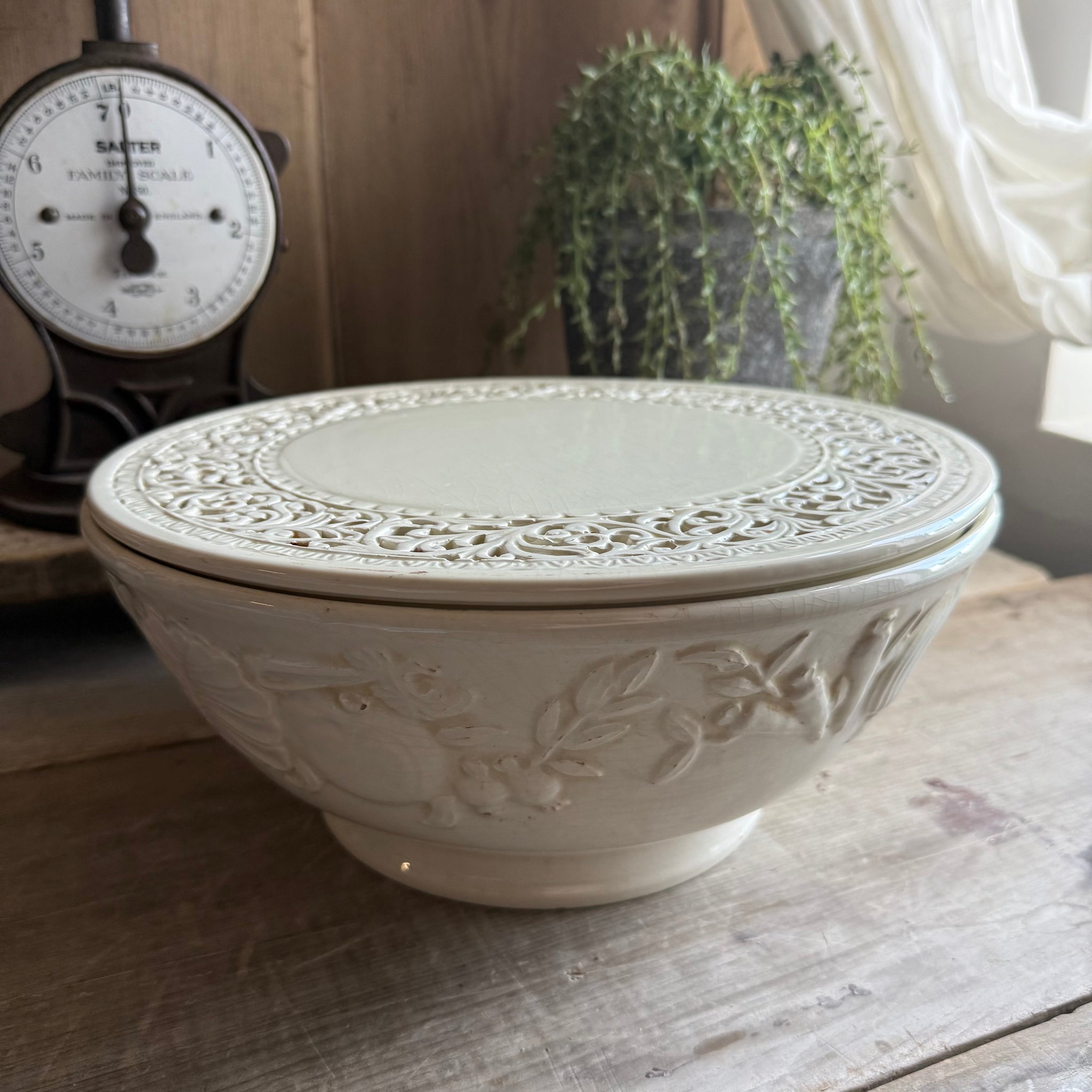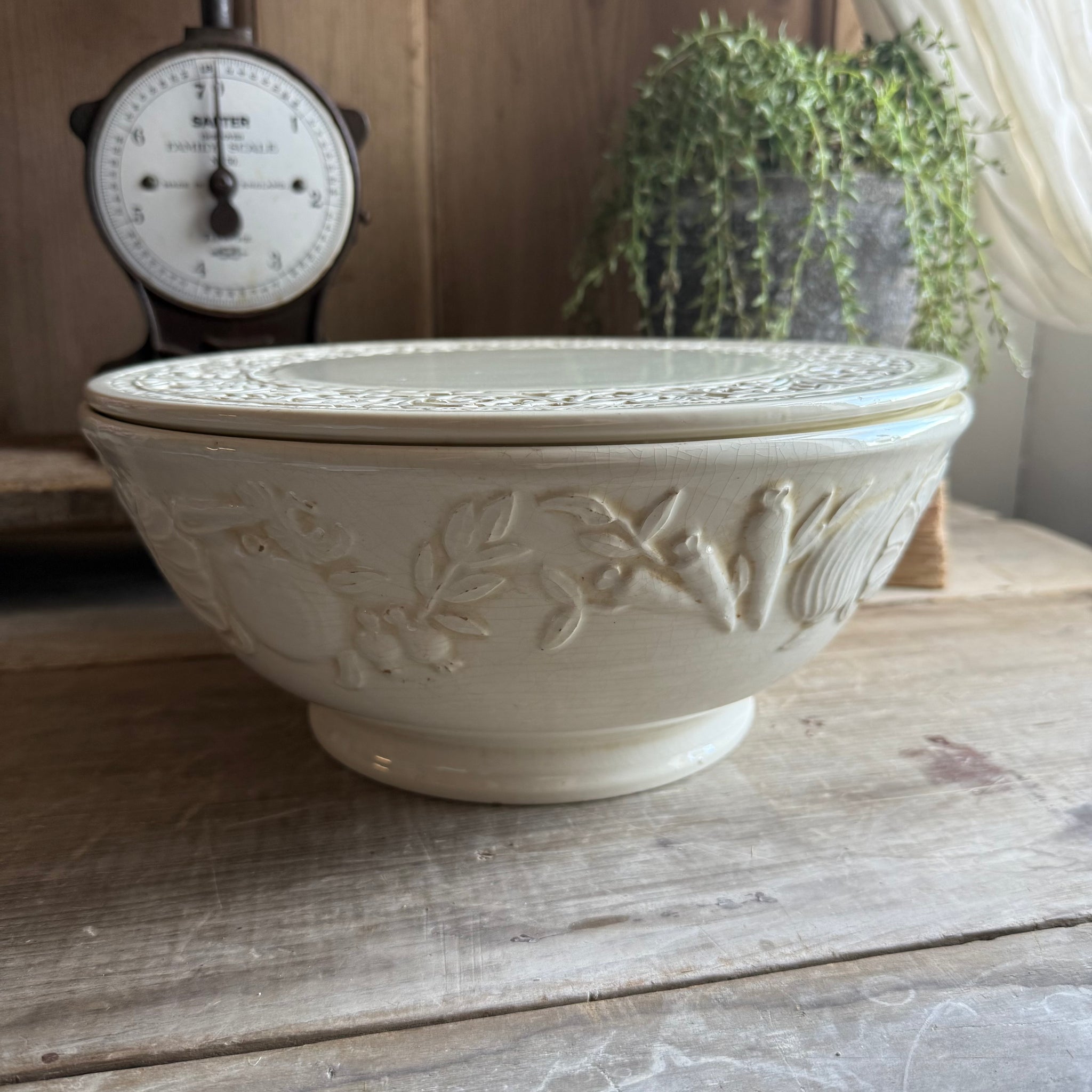 A gorgeous bowl with embossed vegetables around the edge. The lid can also be used as a stand for the bowl, or as a totally separate piece.
