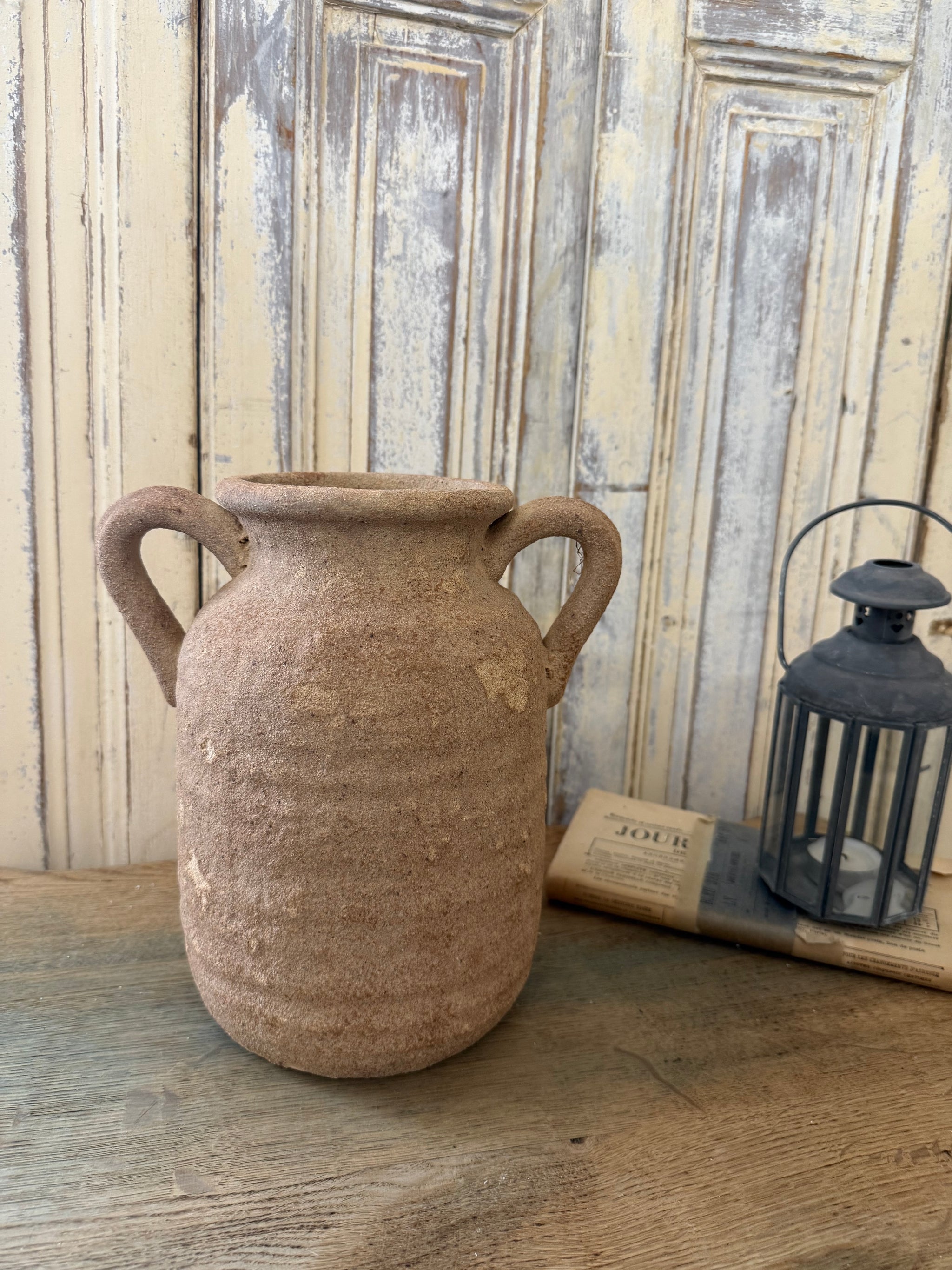 This vase exudes rustic charm with its textured finish and intricate handles, making it a perfect addition to any home decor.