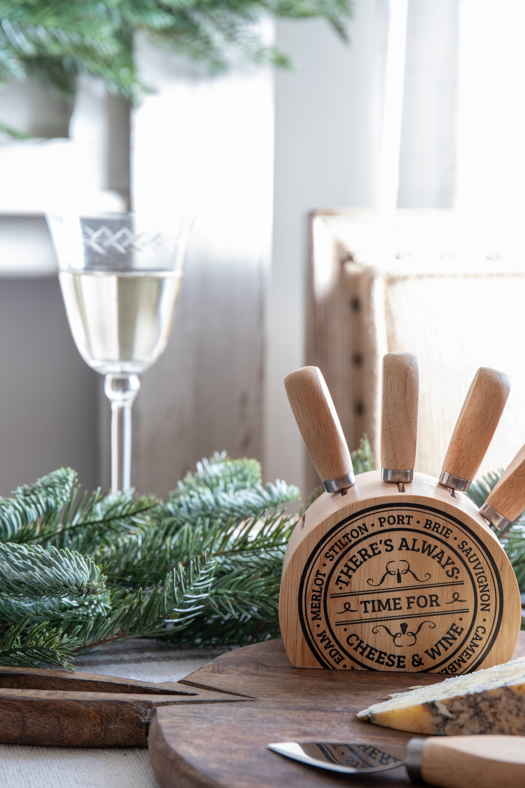 A set of 5 wooden handled cheese knives, in a lovely wooden block, the perfect addition to all cheeseboards and a wonderful gift.