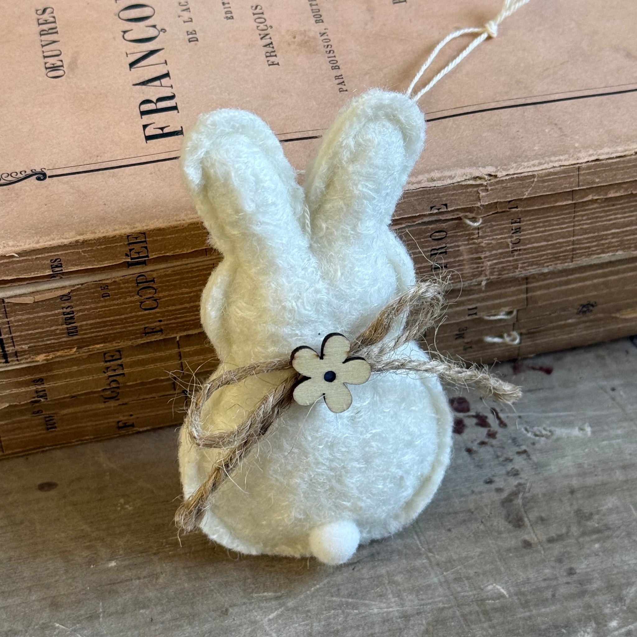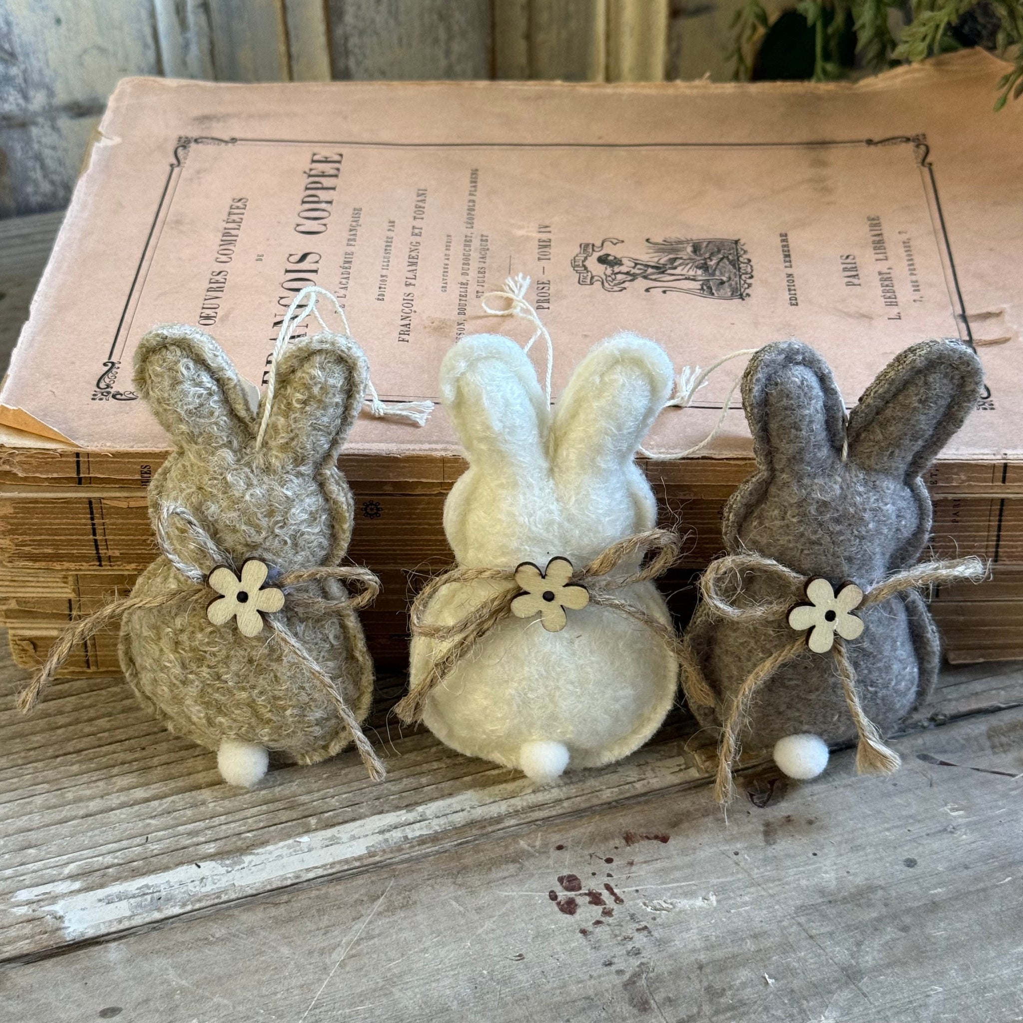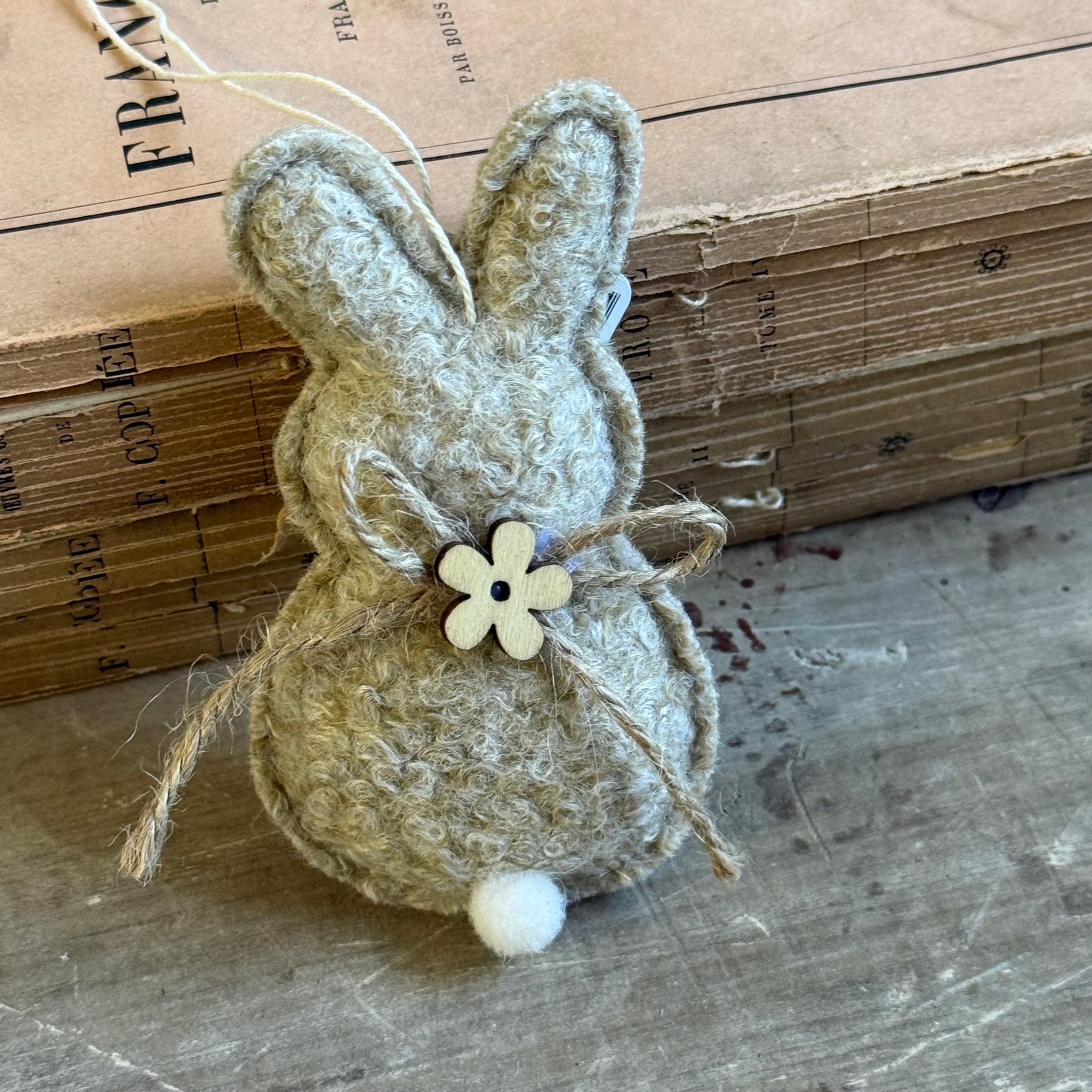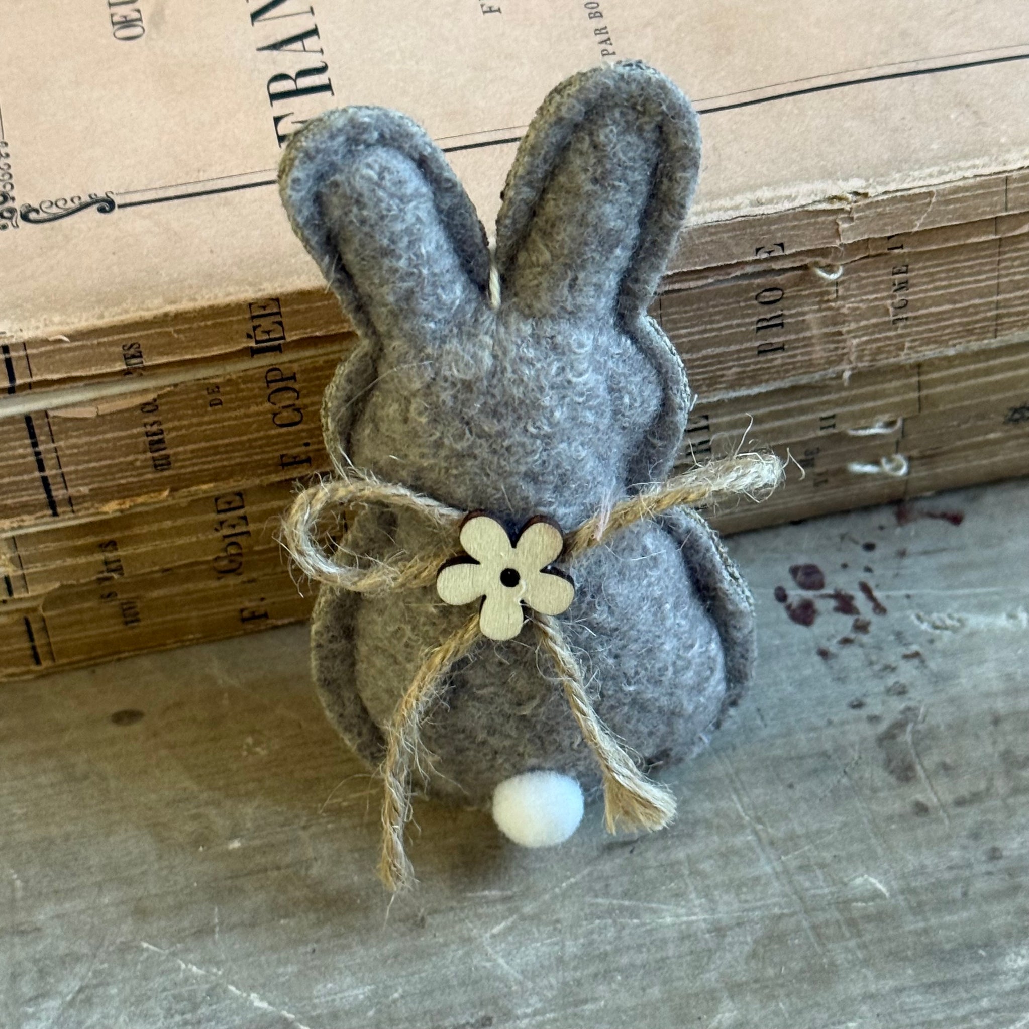 Felt bunnies in white, grey and natural colours. Complete with a dainty wooden flower and jute string bow.