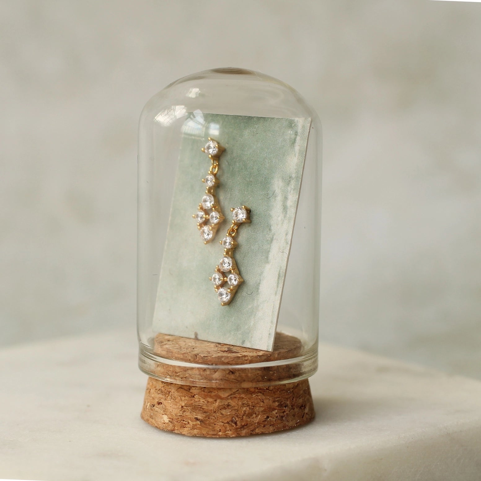 These wonderful stud earrings are a tiny and charming take on a traditional chandelier earring, scaled down to make dainty studs! They are made with gold plated Sterling Silver and Cubic Zirconia. They measure just 11mm (half an inch) in length. These stud earrings come mounted on a linen presentation card. Includes a well crafted glass presentation cloche. They transform the earrings into tiny historical specimens, and make a beautiful and engaging gift idea.